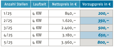 Im Rahmen der Initiative Fachkräfte für den Mittelstand können Mitgliedsunternehmen im Bund der Steuerzahler Sachsen e.V. das exklusive Angebot für Ihre Stellen-ausschreibungen zum Viertel des Normalpreises nutzen. Für eine Laufzeit von vier Wochen können sich Mitgliedsunternehmen eines der exklusiven 25 Stellenausschrei-bungsfelder auf MeinStellenwert.de sichern. Zwei Felder gibt es zum Vorzugspreis von 350 EUR, fünf Felder zum Preis von nur 800 EUR für vier Wochen!
